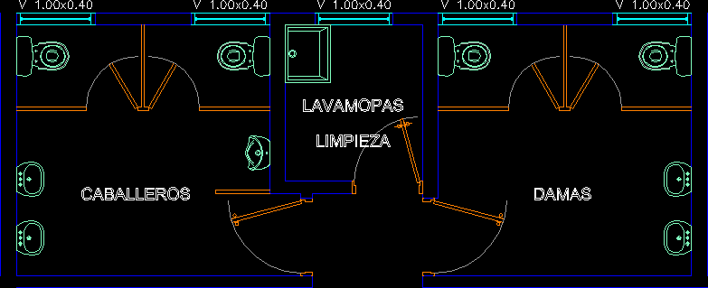 Bayanlar ve baylar 8.60x3.20 m için tuvalet Sıhhi tipik için ticari, Toplantı yerleri, iş, evler, ofisler, vb... = 8.60x3.20 m. temizlik ya da ortasında iki tuvalet yıkama için bir oda da dahil olmak üzere toplam boyutudur. |