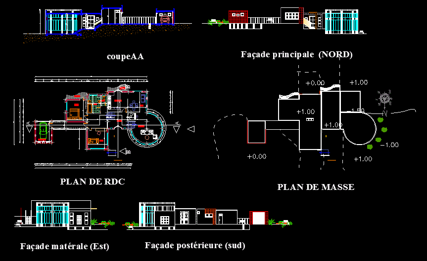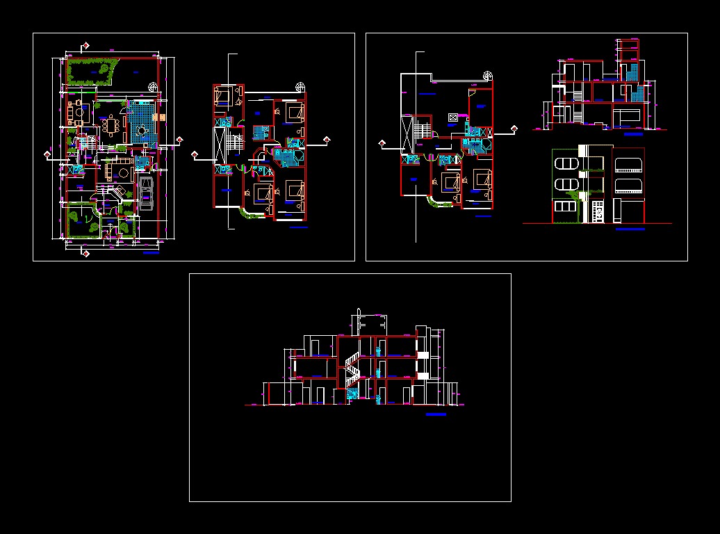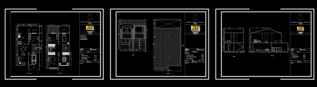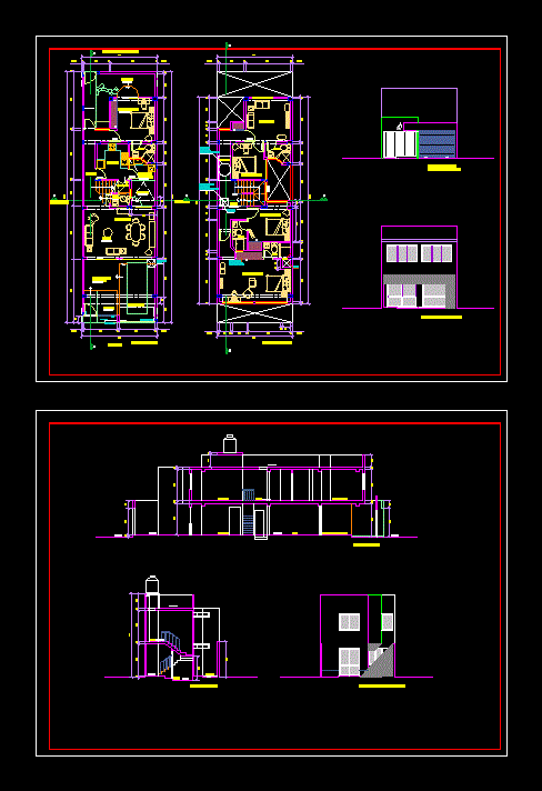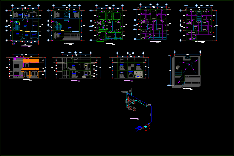 Konut iki bitkiler Bir ev, tasarım tasarımı kat planları, ön ve yan içerir. |