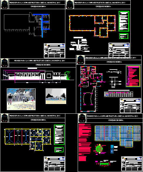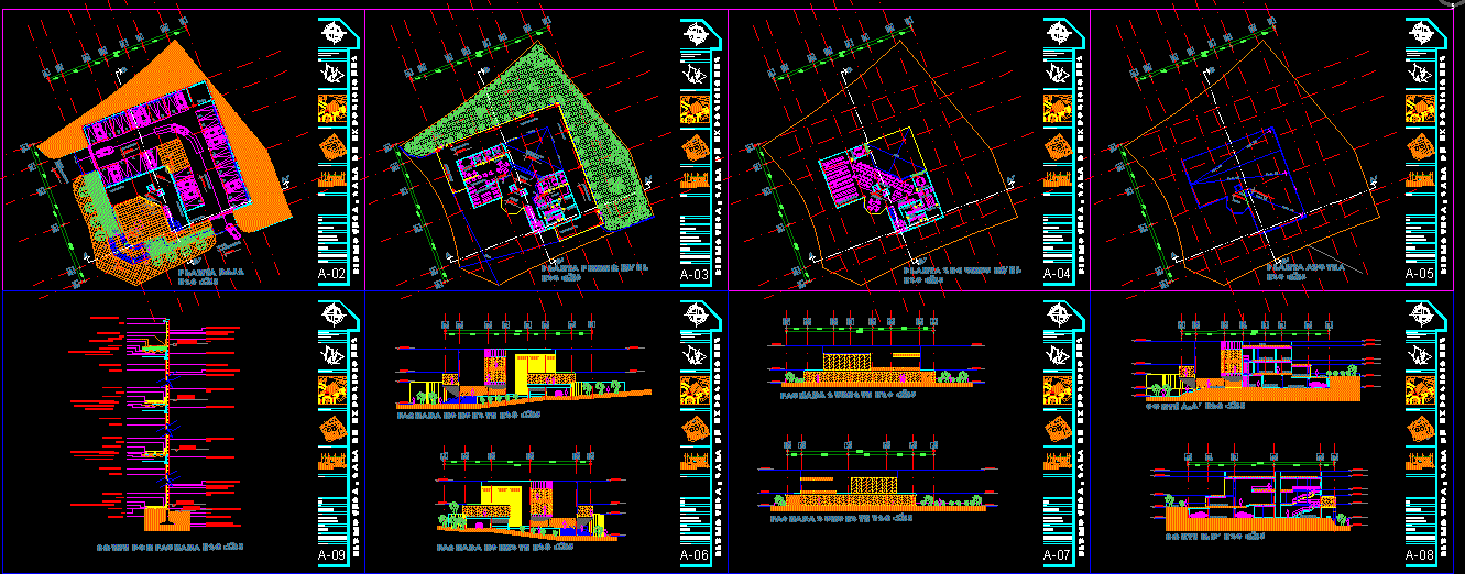 Taslak Kütüphane Kütüphane ve Sergi Salonu. Mimari çizimleri. Bitkiler, bitki park yeri, 1. düzey katı, 2 düzey kat, çatı bitki, kesme, cephe ve önünde kesmek içerir. |