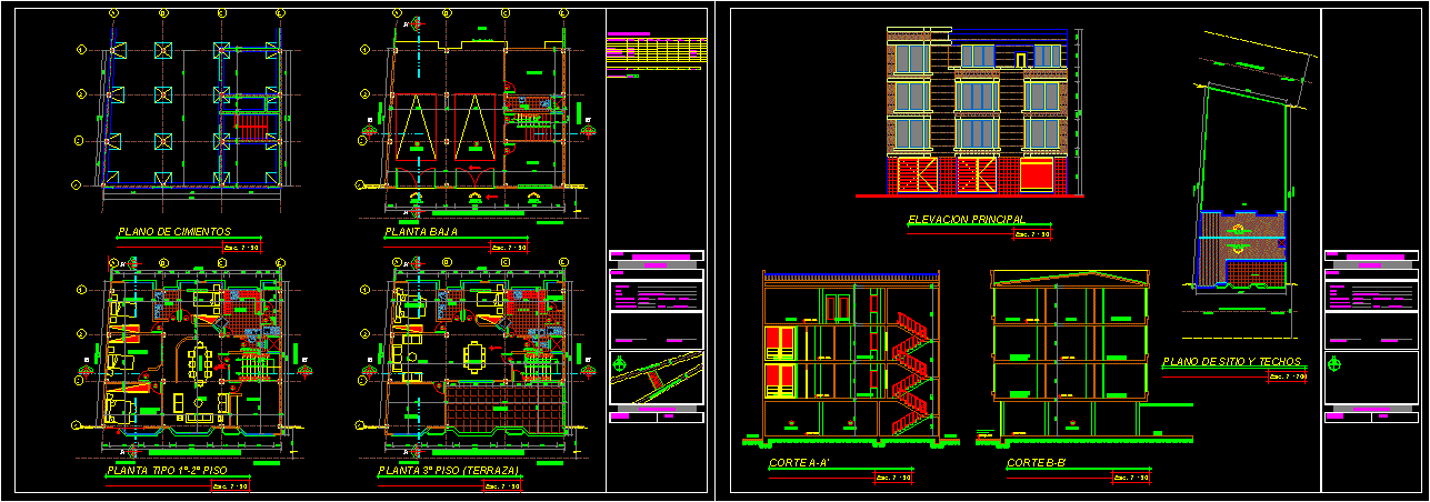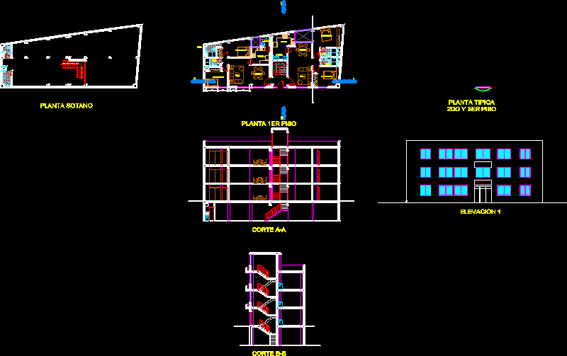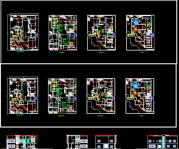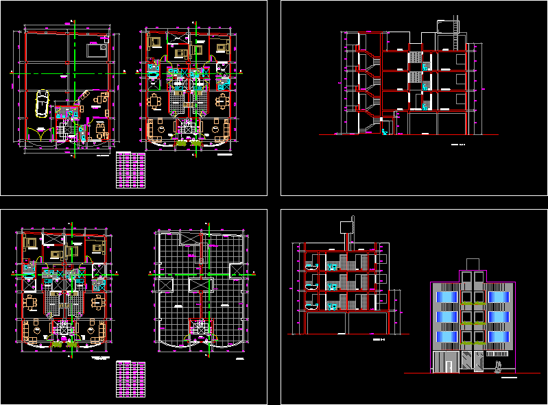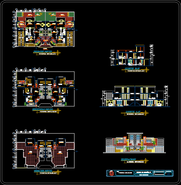 Multifamily Multifamily Bina 3 katlı ve temel planı, genel bitki, enine ve boyuna kesim, ana yükseklik oluşur. |