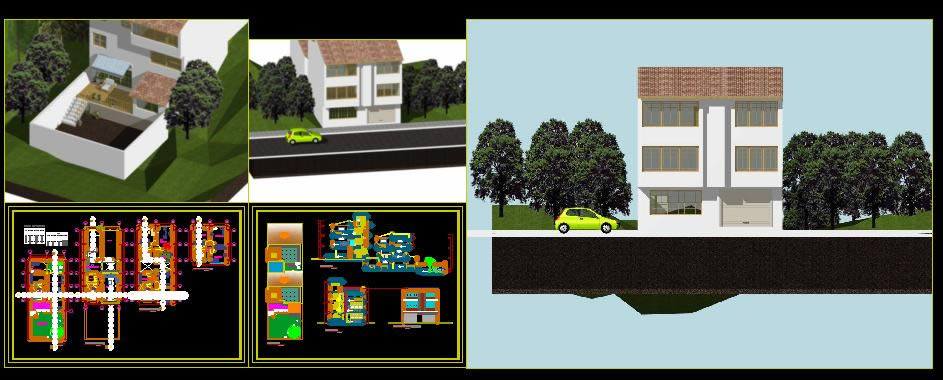 Konut -Bitki - cephe - mutfak - oturma odası - iki yatak odası detayını konut |