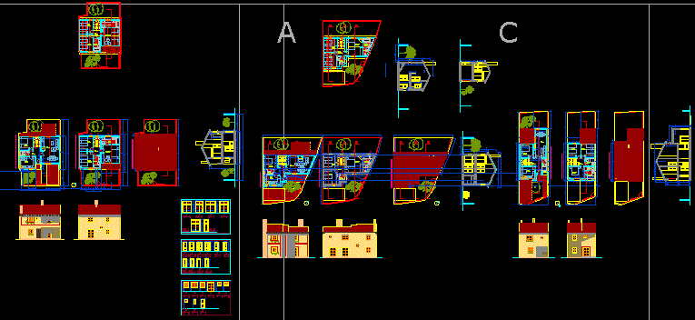İçerilen konutlar -Çizimleri - 3 yatak odası çift yönlü - bitkiler - bölümler |